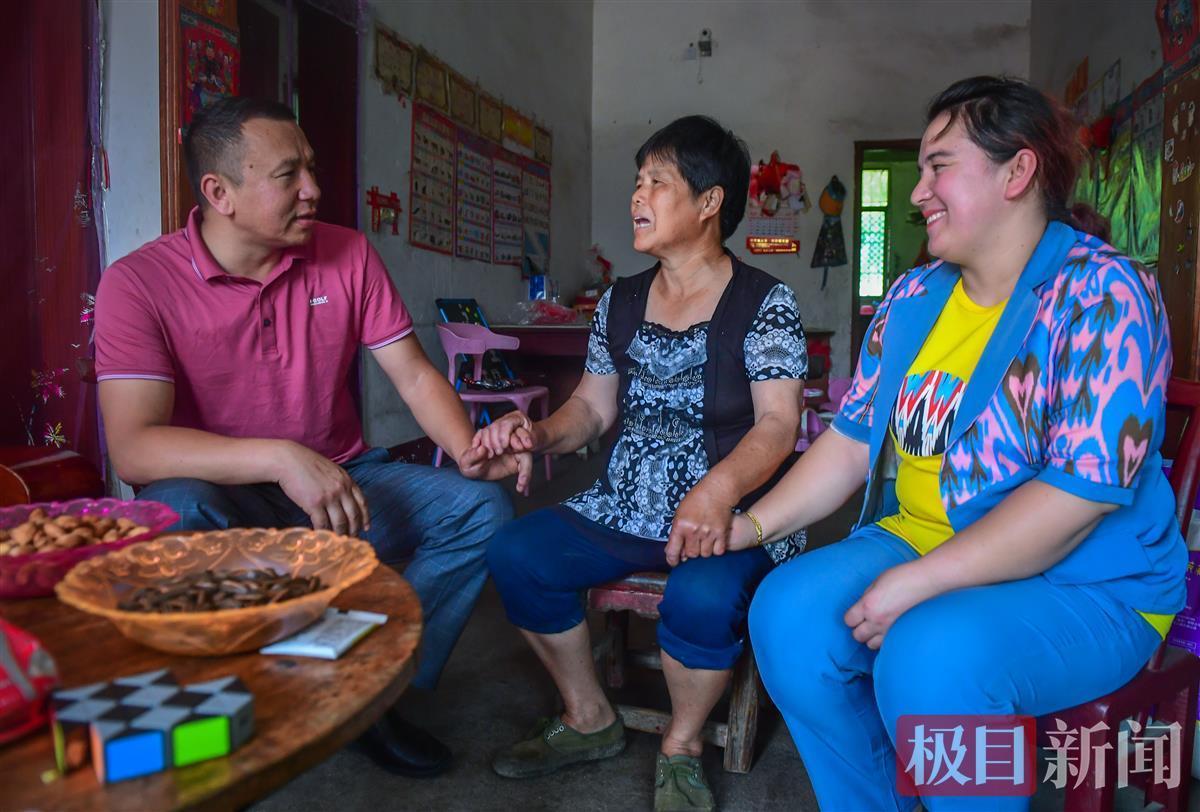 受帮扶村民瞿芳林紧紧拉着麦提托合提·艾合麦提夫妻俩的手