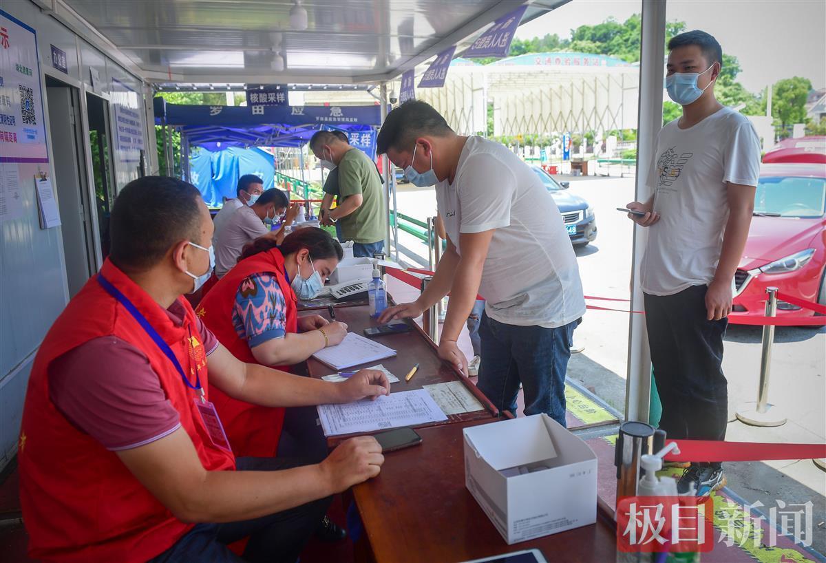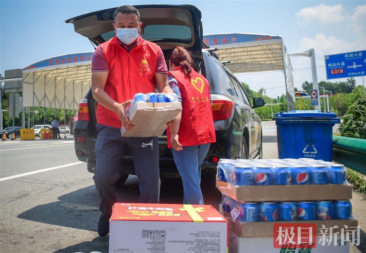 5月25日上午11时许,沪武高速公路湖北罗田县出口,疫情防控志愿者服务岗,新疆小伙麦提托合提·艾合麦提穿着红马甲,耐心查验出站人员的健康码、行程码及其他登记信息。此前一小时,他买了四箱可乐、四箱纯净水、四箱泡面,送给在此值守的疫情防控人员。