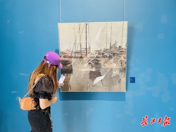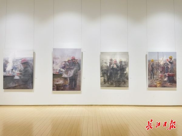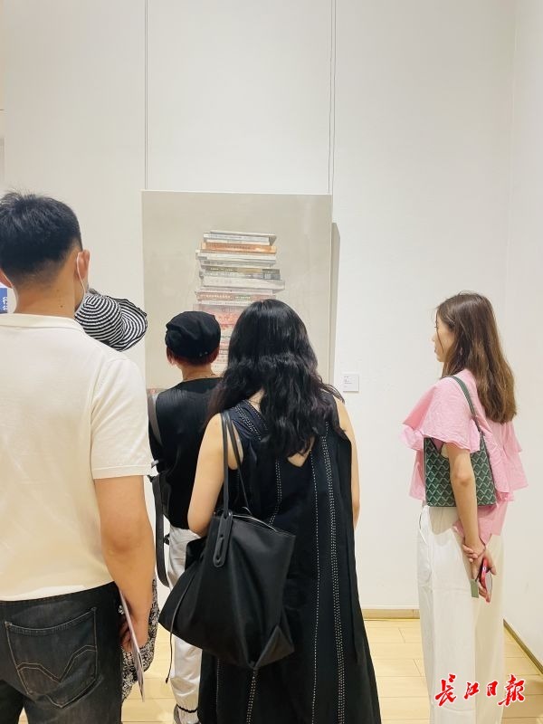 步入展厅,首先映入眼帘的是湖北大学艺术学院教授杨帆近10年的作品。记者只见不少市民在《历程》这幅作品前驻足,杨帆说:“这幅作品远看是一摞书,仔细看是我的老师刘寿祥先生的画集,我用这种方式来表达我对恩师的怀念。”在展厅中,还能看到杨帆此次以农民工为题材创作的工地系列作品《工地晨曲》和展现武汉市民精神面貌的《二号线》,以及以江汉平原风物为创作对象来表达他对家乡依恋的多幅作品。