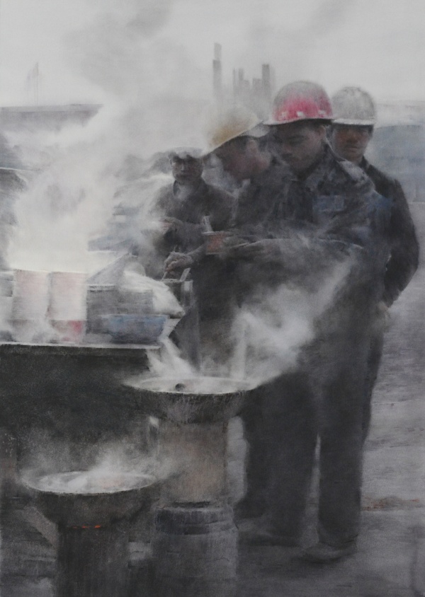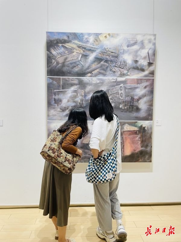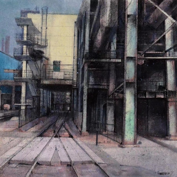 每个艺术家的作品都同他的生活、他的所见所闻密不可分。湖北大学艺术学院副院长、教授尹朝阳在青山生活了二十几年,此次他参展的作品以工厂系列为主。尹朝阳说:“我第一次走进武钢,大工厂的工业化气派及交错林立的管道结构,给我带来肃穆感、沉寂感的同时,更多的是力量感。它的线条色块更是激发了我的创作欲望。”正是因为如此,尹朝阳的水彩作品总带给人一种厚重感。