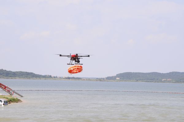 水上演练科目的设置也极具专业性,展现出S型绕标、舟艇翻覆自救、O型救援、无人机快速救援等一系列水上专业救援技术。“舟艇翻覆自救是指因水流湍急导致橡皮艇翻覆,救援人员相互配合,利用绳索合力将舟艇翻正实施自救。”解说员说道。