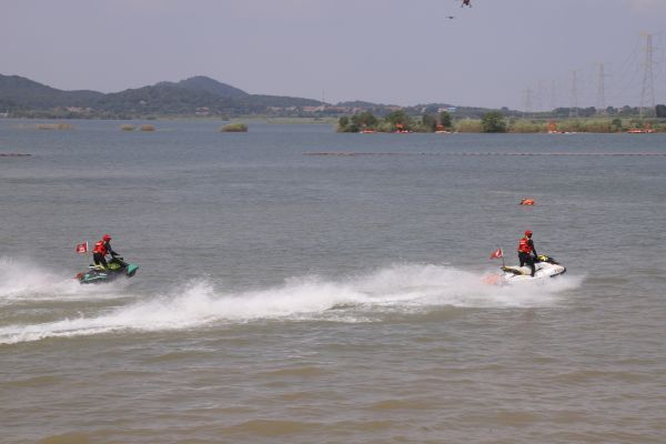 只见救援人员模拟出突遇激流的情形,橡皮艇不幸侧翻,四名救援人员纷纷落水。随后,两名救援人员率先爬回翻覆的艇上,安装固定绳索,四名人员一同利用绳索合力将翻覆的橡皮艇摆正,并帮助其余两名救援人员爬回艇上,整个过程仅用时五分钟。上午10时30分,八项演练科目全部顺利完成。