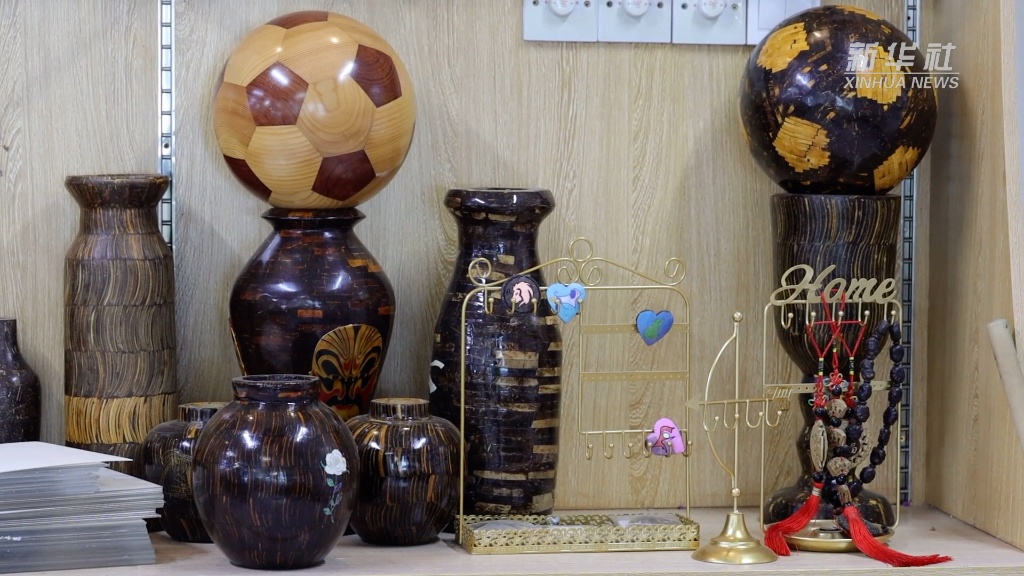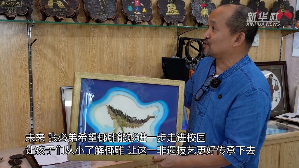 2015年,从小接触椰雕的海南琼海人张必弟从深圳回到家乡,将椰雕工艺品制作与电子产品、纪念章、文创产品等相结合,让传统椰雕融入现代生活。