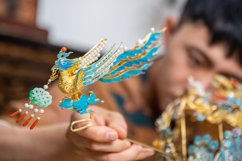 “这件作品名叫‘凤引九雏’,是我很满意的一件作品。”辜国强端起一顶精美的凤冠,冠上的龙、凤、流苏都可单独拆卸,每一样也可单独搭配发髻装饰,增加了头冠的实用性,为日常搭配提供了更多可能。