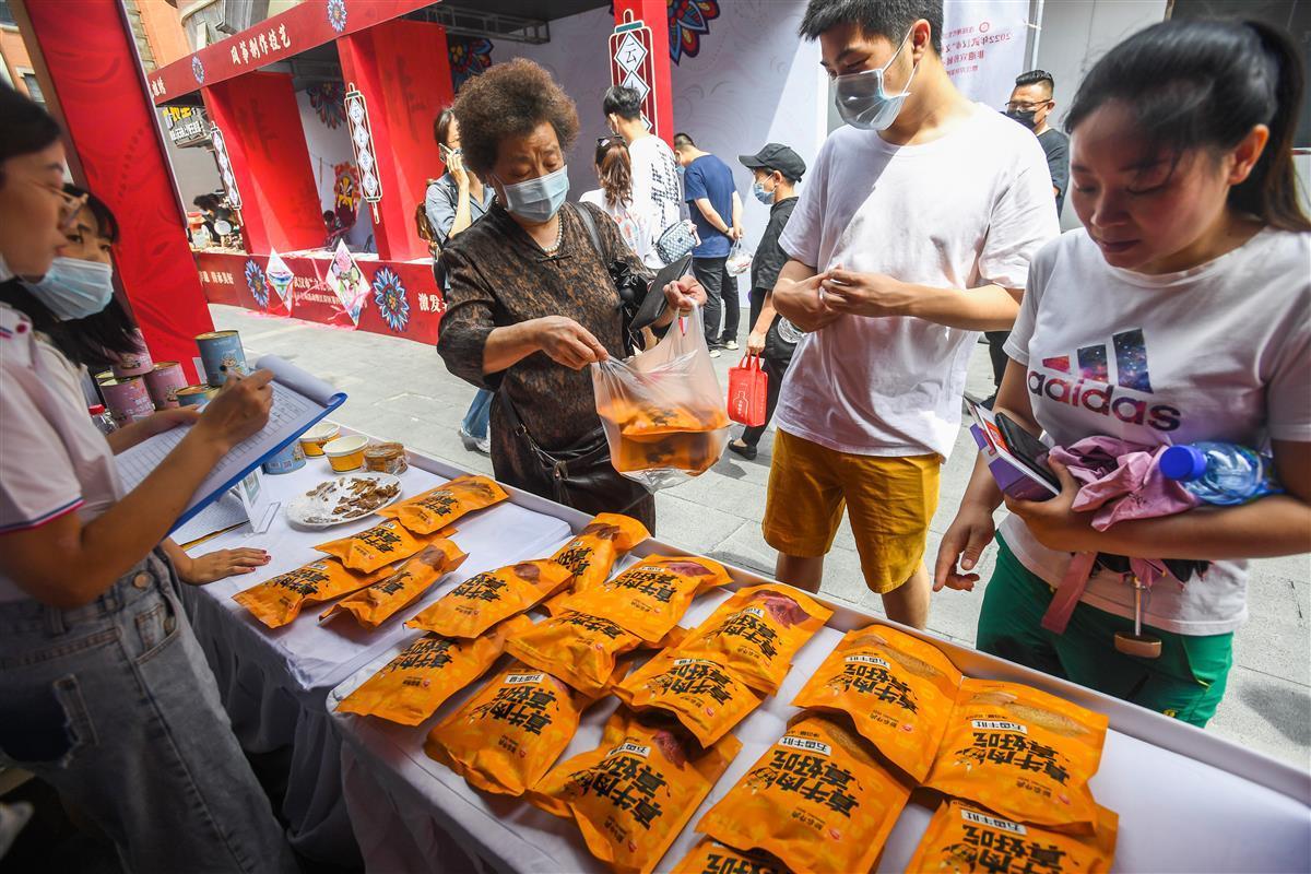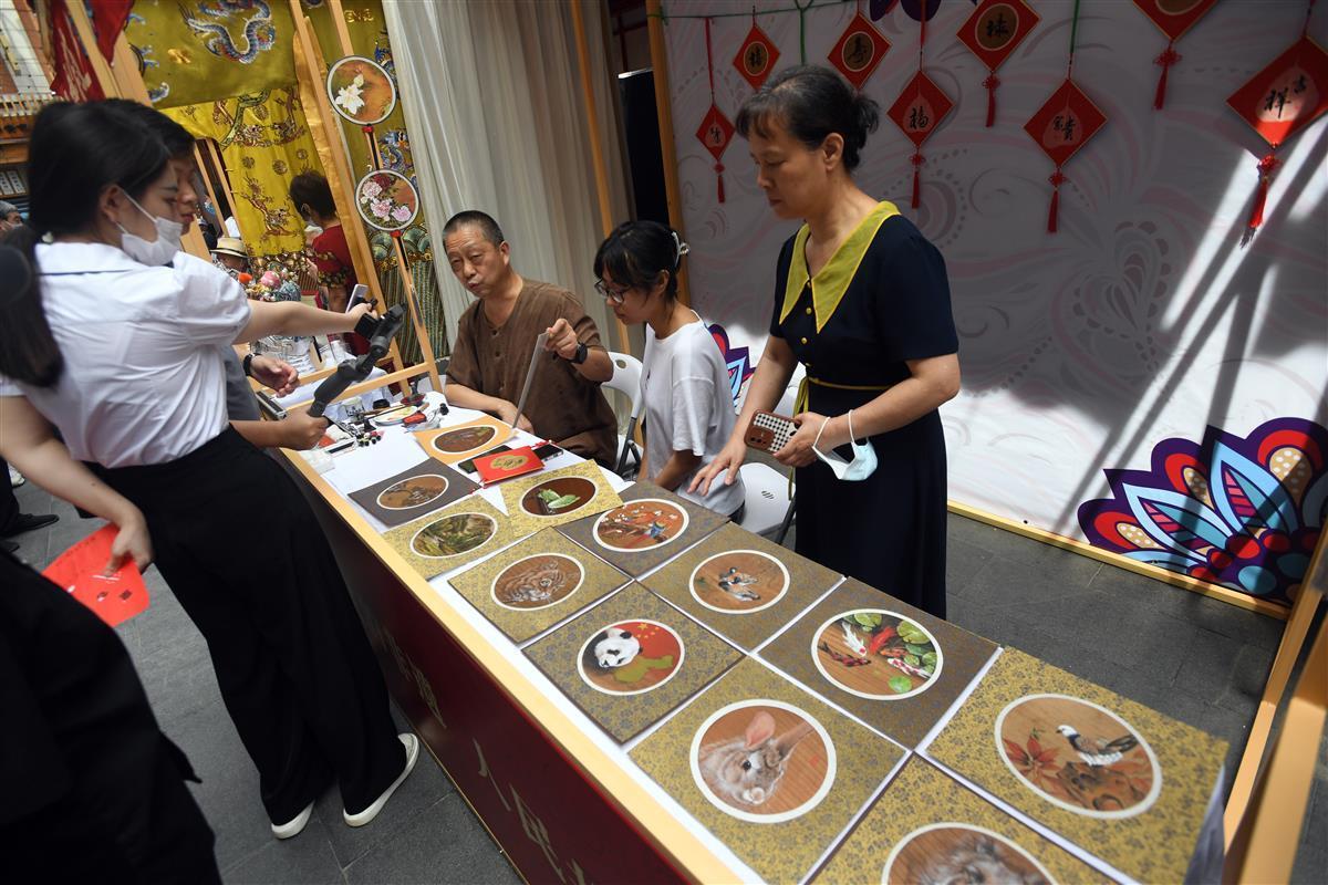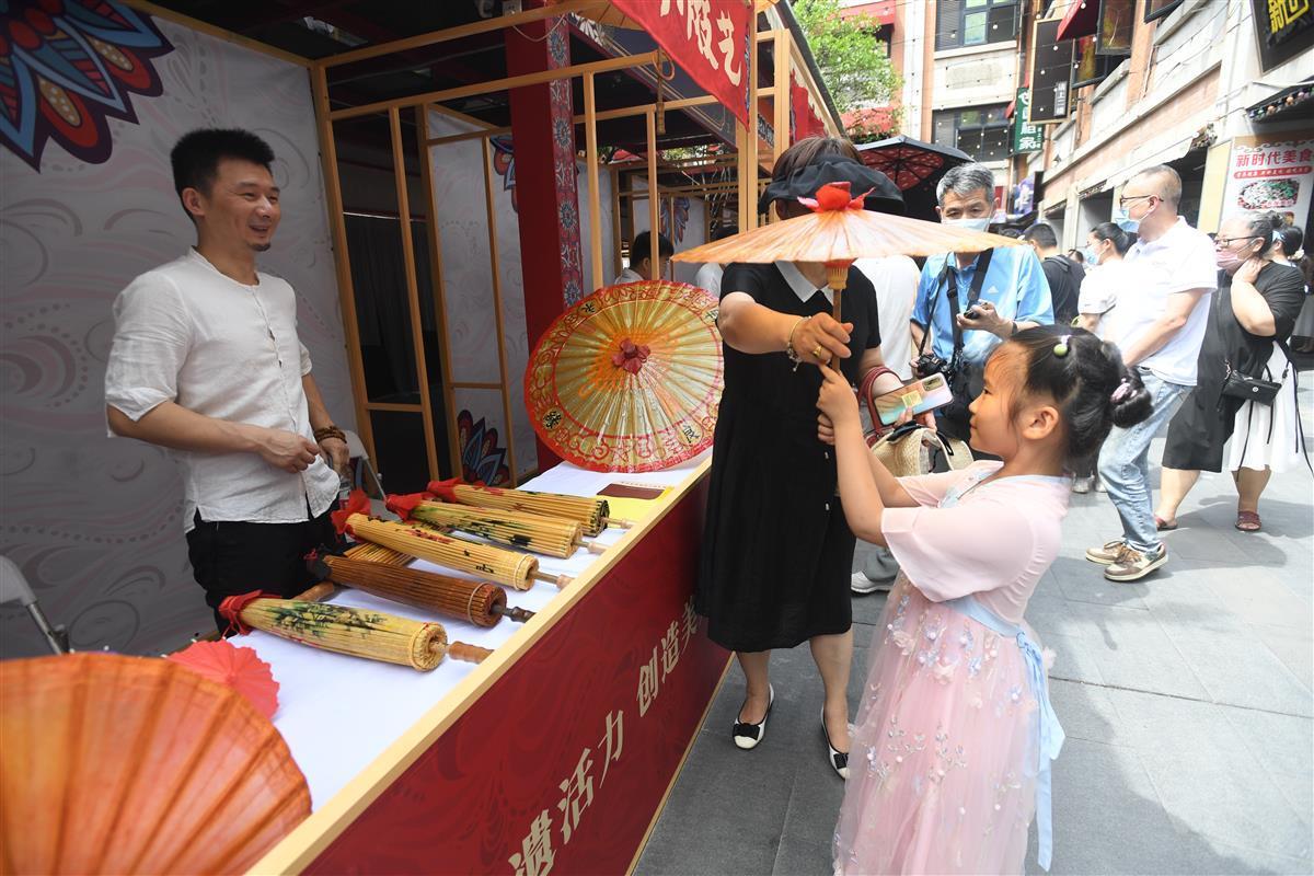 今年的主题为“连接现代生活、绽放迷人光彩”,在当天吉庆街开展非遗购物节活动中,通过线下售卖、线上直播带货的方式,8家老字号非遗企业店铺进行堂食经营,近60项非遗项目通过展演、传承人展示、图文展板、网络直播,讲述着非遗带给生活的美好、与生活零距离的故事。