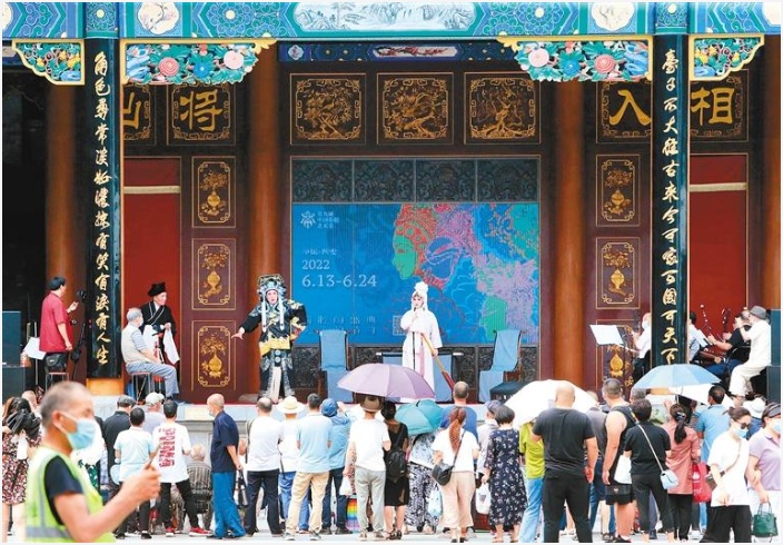 6月12日,易俗社文化街区秦腔大戏《游龟山》吸引了不少市民顶着烈日来看戏 。