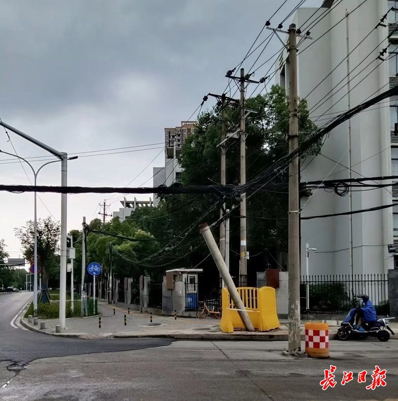 6月12日,长江日报记者在现场看到,倾斜的电线杆上并没有电线,其长度仅为旁边正常电线杆的三分之一,因该电线杆距人行道很近,其底座被两块护栏围了起来。