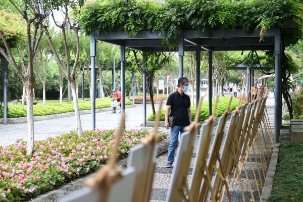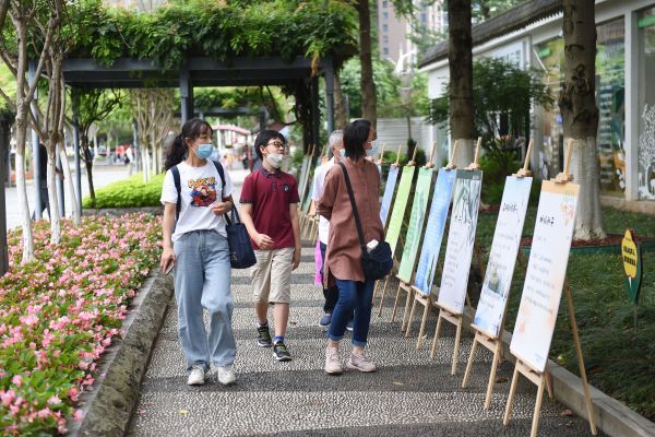 公园里的自然童诗展览,吸引不少游客驻足品读。记者许魏巍摄