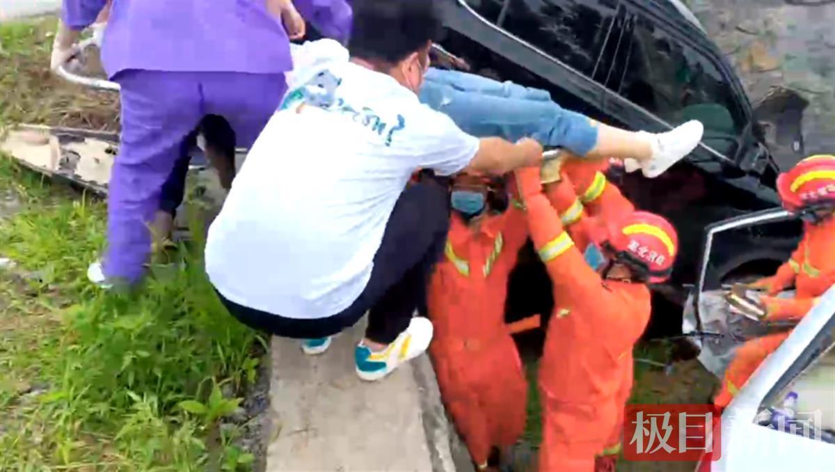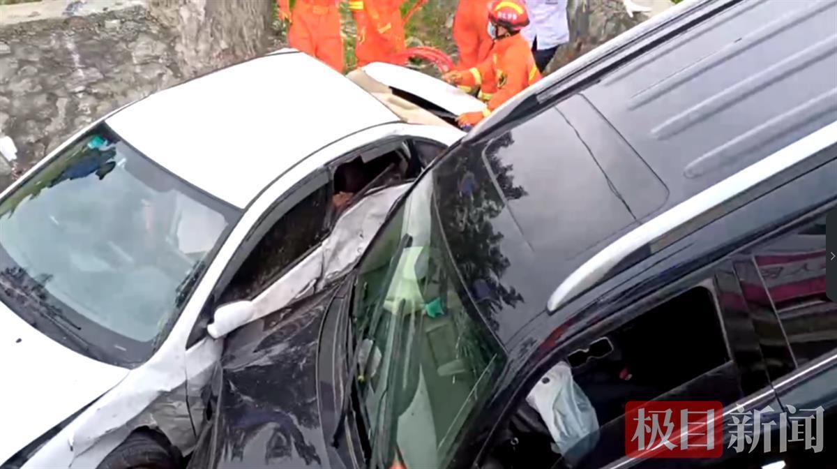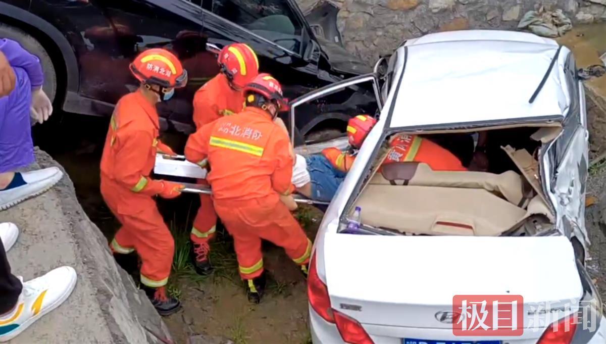10时30分,消防人员迅速赶到现场。发现一辆白色小车掉进路边一条深两米多的排水沟里,一辆黑色车半悬在沟沿,车头正插进白色小车左侧,白色小车被撞成凹型,两边前后车门都打不开,一男一女被困车内。