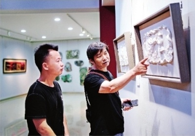 江汉大学美术学院优秀毕业作品展上,姜峰(左)和指导老师马兵林交流创作陶艺作品《婚礼进行曲》的体会。