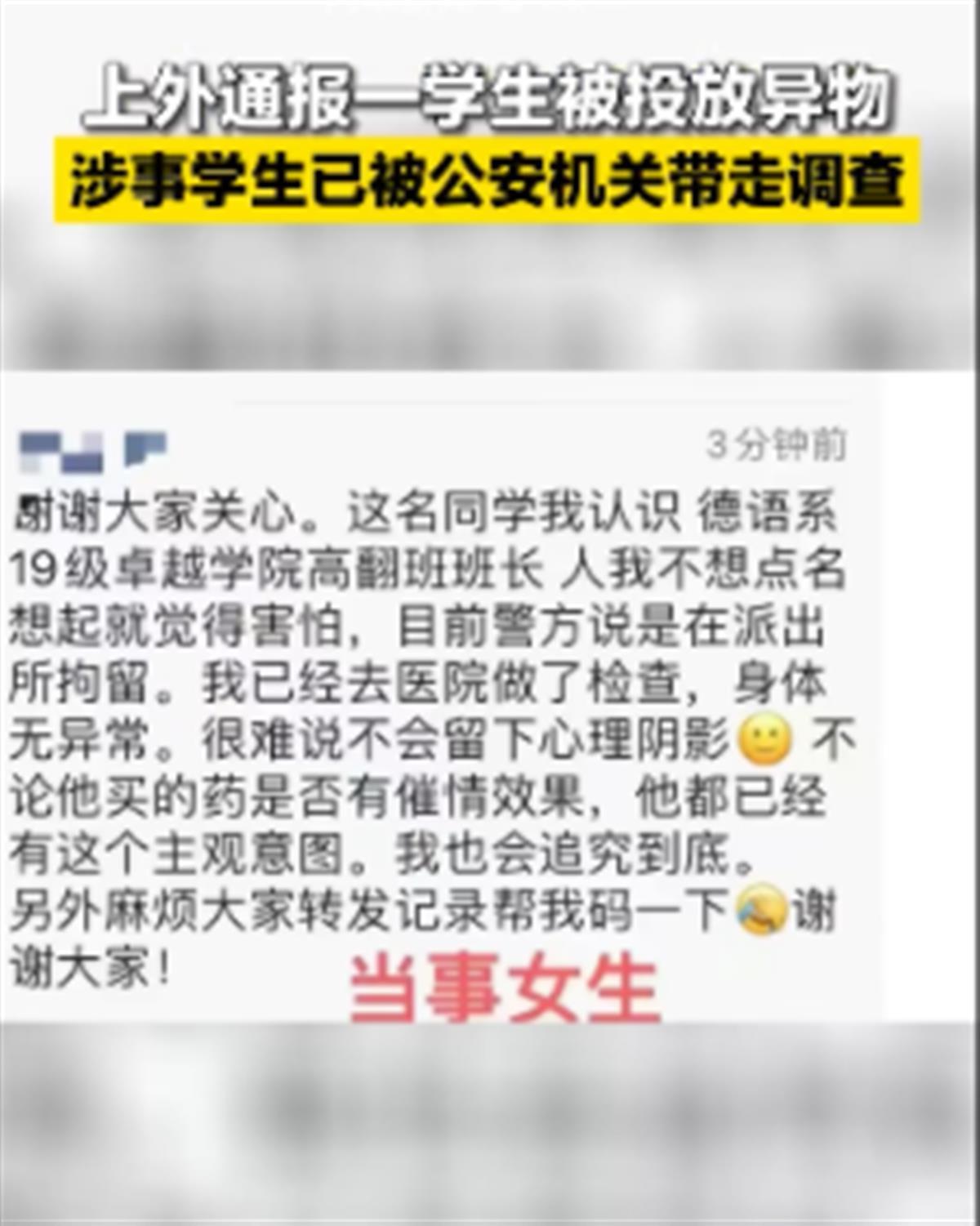 6月12日,上海外国语大学官博发文回应称,已成立工作专班负责协助公安机关调查此事,一经查实,将依法依规严肃处理。目前,该校暂未公开通报最新的处理进展。