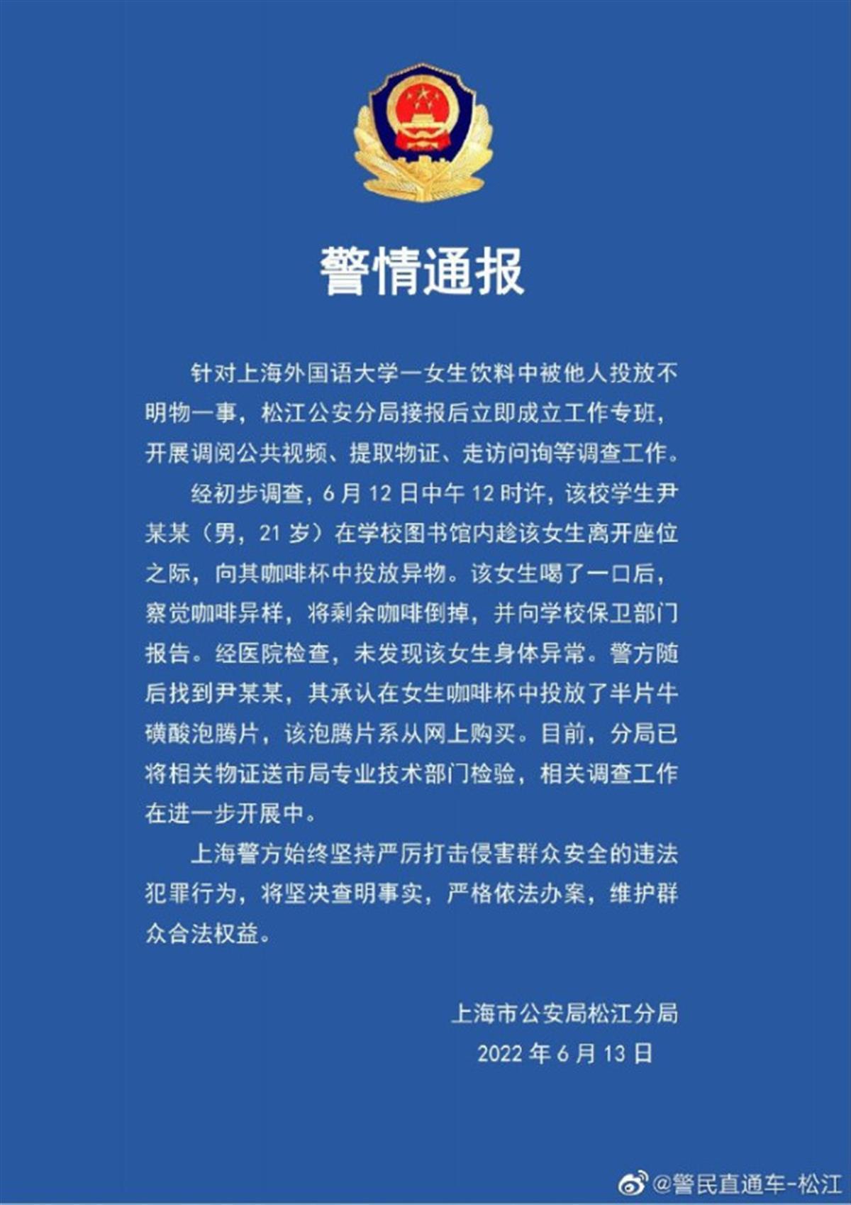 据上海市松江区警方通报,6月12日,上海外国语大学学生尹某某在学校图书馆内趁一女生离开座位之际,向女生饮料中投放异物,男生向民警承认投放的是半片牛磺酸泡腾片,系网购得来。警方已将物证送检,正在进一步调查此事。