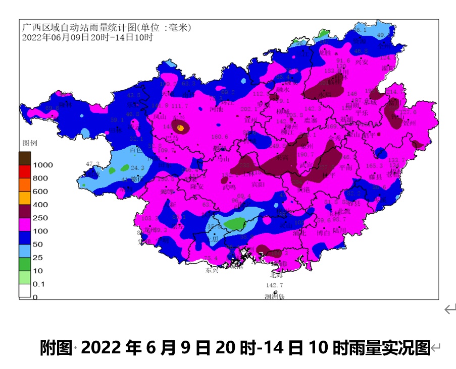 暴雨范围广,累积雨量大。6月10—14日,累积雨量超过50毫米的有14市113县(区)1136乡镇(占全区总乡镇数92.1%),其中超过100毫米的有14市108县(区)804乡镇(占比65.2%),超过250毫米有10市33县(区)82个乡镇(占比6.7%),超过400毫米为河池市东兰县三石镇495.8毫米、来宾市兴宾区大湾镇402.9毫米、河池市巴马县凤凰乡402毫米。