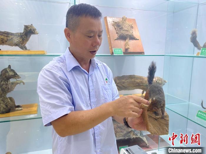 图为郑海强介绍红颊长吻松鼠标本的制作过程。 符宇群 摄