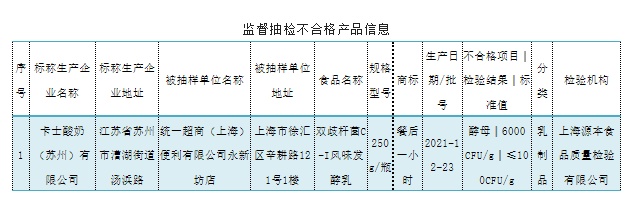 6月13日,上海市市场监督管理局网站发布2022年第7期省级食品安全抽检信息。本期检出标称卡士酸奶(苏州)有限公司生产的1批次“餐后一小时”双歧杆菌C-I风味发酵乳不合格。