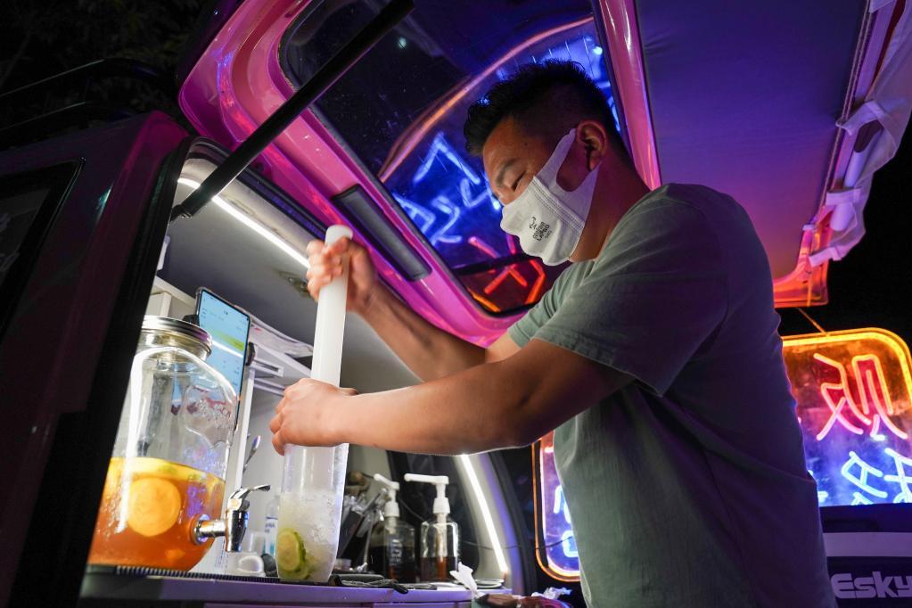 在五马渡后备箱文化市集,一位后备箱摊主制作柠檬茶。新华社记者李博 摄