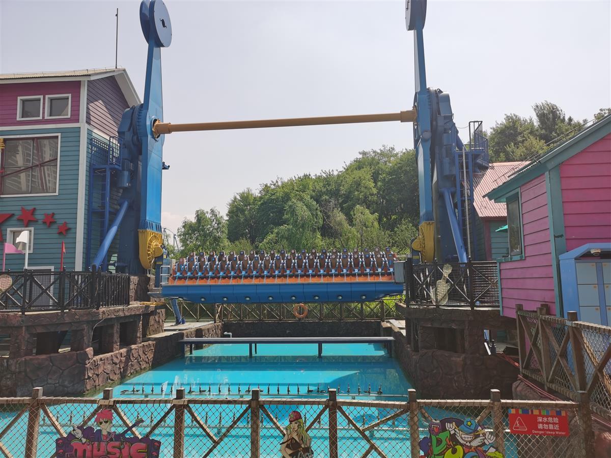 一声轻微的排气声后,设备启动旋转,武汉欢乐谷的明星项目“完美风暴”如图一搜蓝色战船,带领15位“游客”翻转、下降,与飓风搏斗。设备翻转游玩正精彩时,突然停止了摆动,“战船”停止在2米空中……