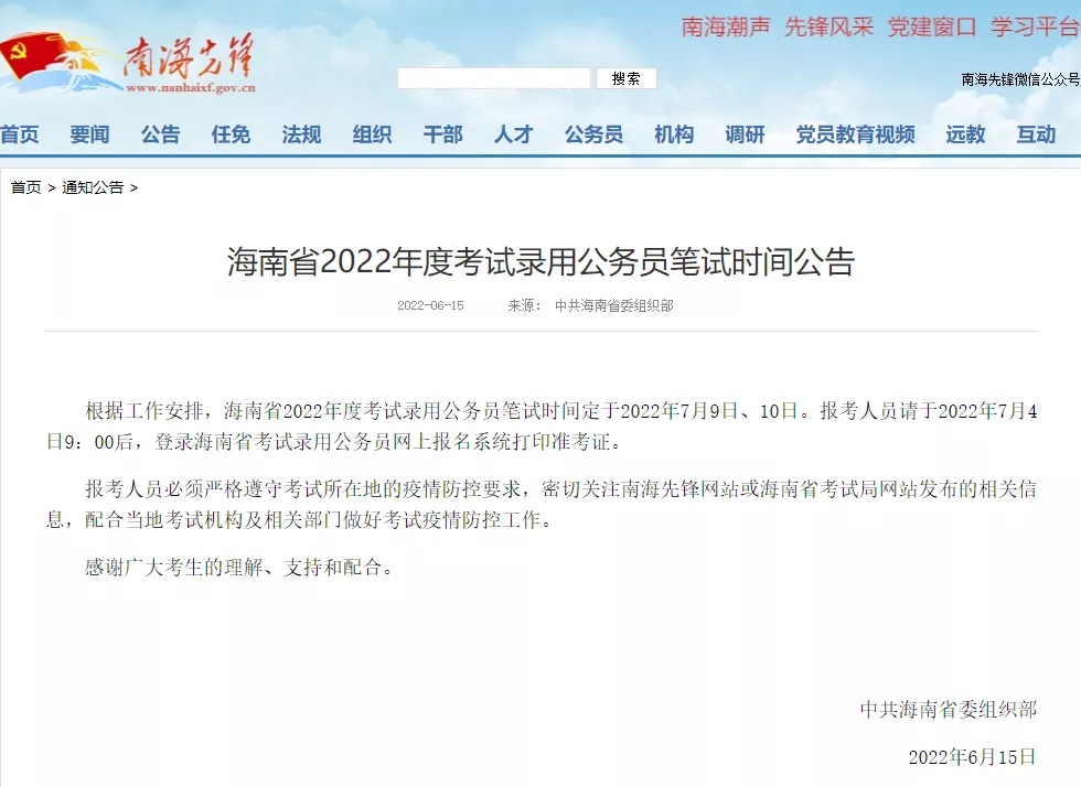 据中共海南省委组织部6月15日发布的海南省2022年度考试录用公务员笔试时间公告,海南省2022年度考试录用公务员笔试时间定于2022年7月9日、10日。报考人员请于2022年7月4日9:00后,登录海南省考试录用公务员网上报名系统打印准考证。