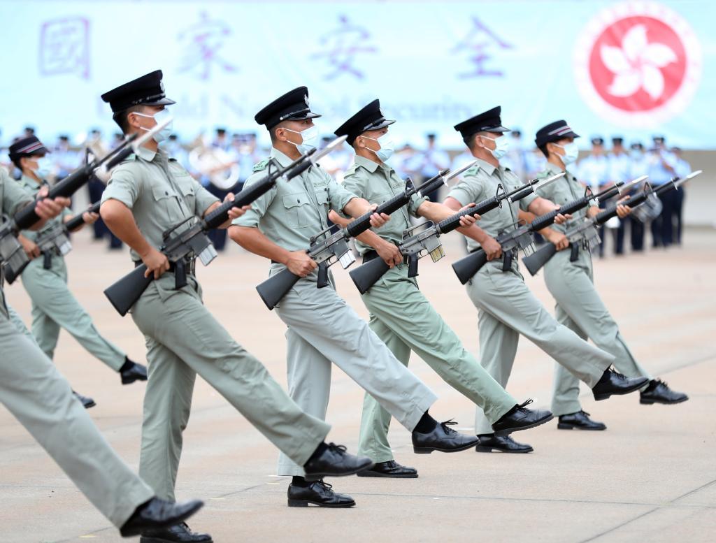 艳阳晴空的一天,记者来到香港警察学院。担任升旗手的警员们操练着中式步操,正在为即将到来的香港回归祖国25周年纪念日升旗仪式进行演练。25年来,每个7月1日的升旗都由香港警队负责。