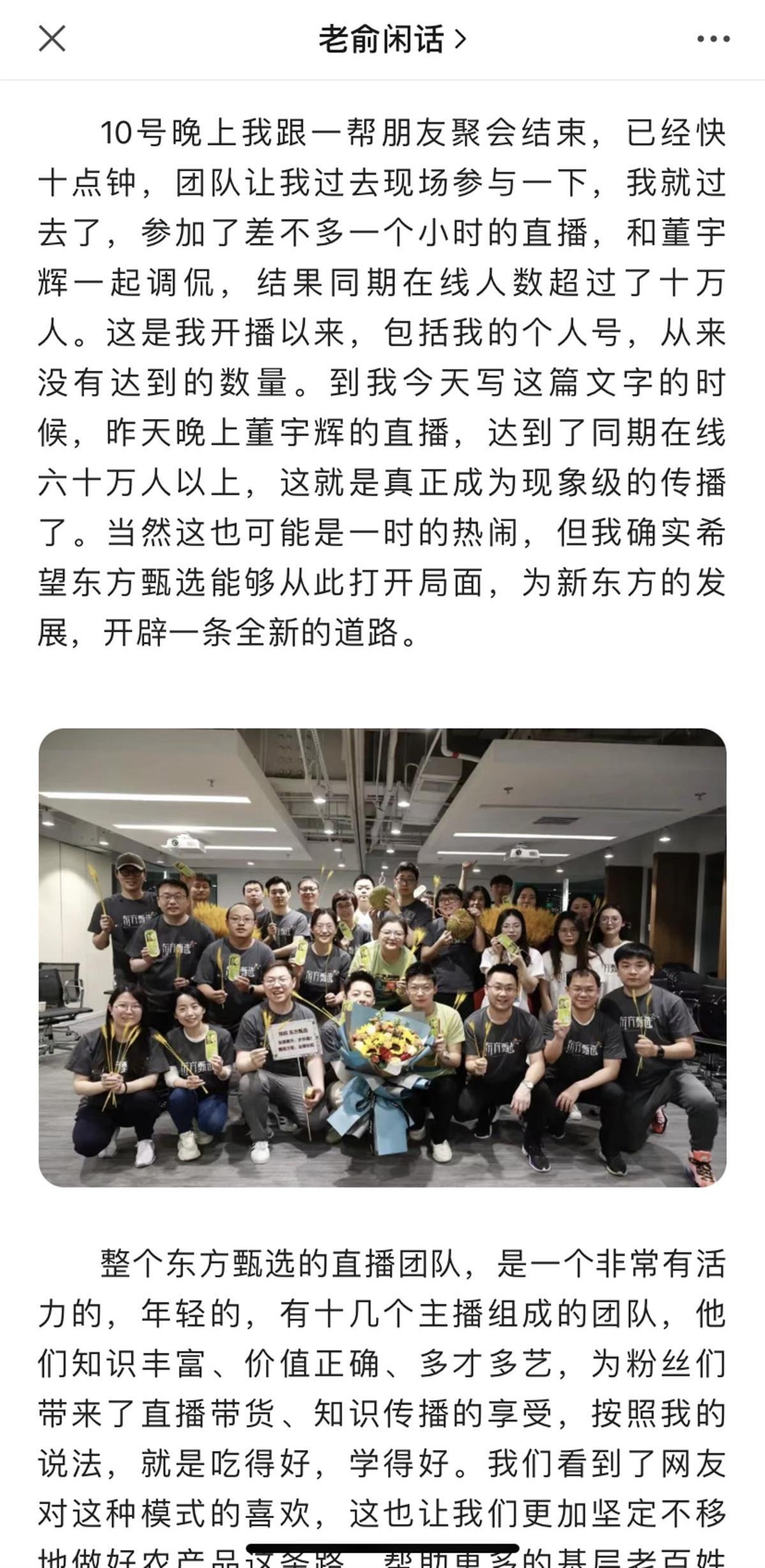 6月16日,俞敏洪在一篇名为《也无风雨也无晴》的文章中对当前局面评价称:“当然这可能是一时的热闹,但我确实希望东方甄选能够从此打开局面,为新东方的发展,开辟一条全新的道路。”