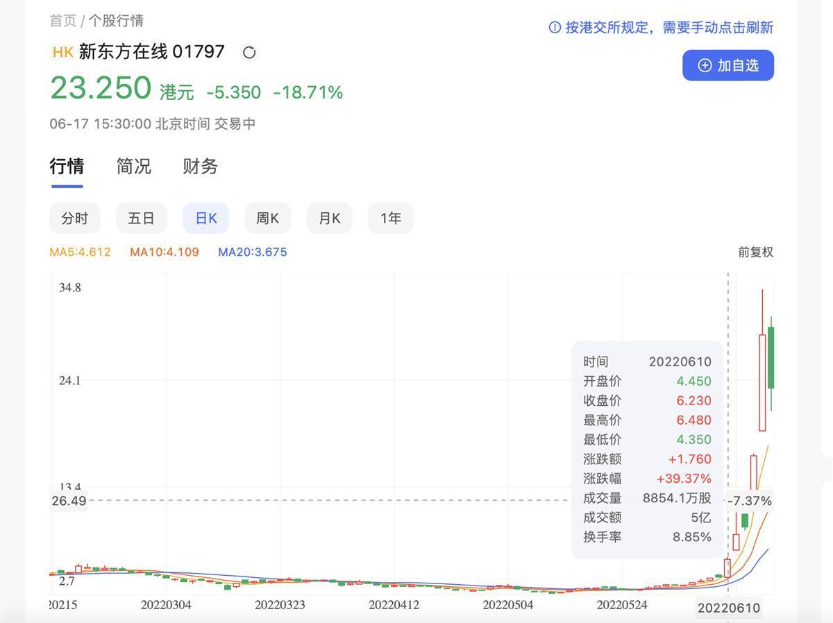 自6月10日,新东方老师董宇辉在直播间带货走红以来,新东方在线的股价已经上涨多日。6月17日开盘,新东方在线港股股价29.3港币/股,较6月初3.6港币/股的价格,已上涨超7倍。不过6月17日当天,新东方在线股价一度跌近20%,最终收盘报24.9元,较开盘价下跌13%。