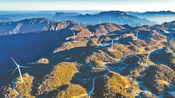 五峰海拔2200多米的独岭之巅,50台风车迎风矗立,“招风”化能。 (刘曙松 摄)