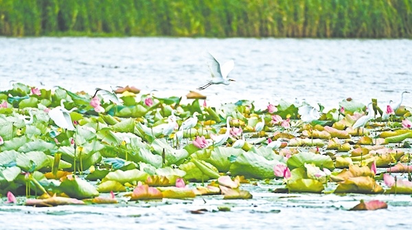 ▲长江岸边的枝江金湖国家湿地公园内百鸟翔集,或水藻中悠闲漫步,或荷花丛中翩翩起舞。短短几年,这里通过生态修复,从养殖场变成候鸟驿站。近年来,枝江市以壮士断腕的决心加大长江大保护力度,深入推进化工企业“关改搬转治绿”,境内109公里长江岸线实现绿化无缝对接,生态环境得到长效改善。