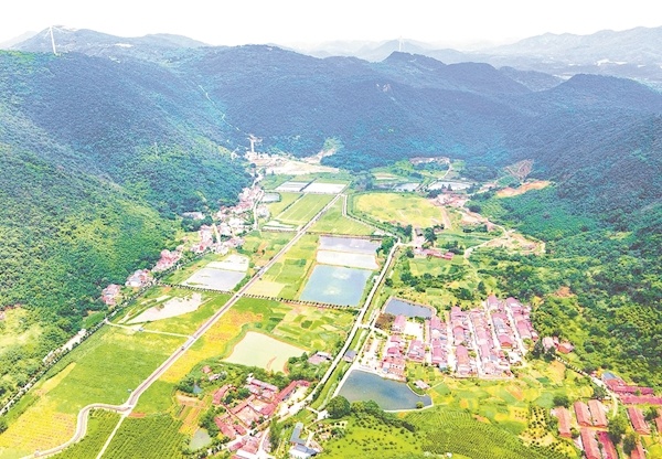 空中俯瞰富池镇港下村,青山环抱、果林遍布,四好农村路纵横交错,构成一幅美丽的乡村画卷。