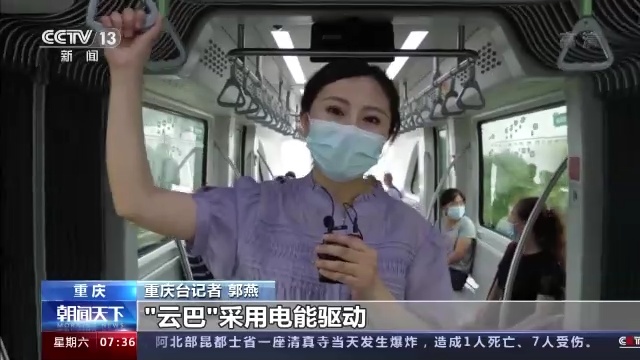 重庆台记者 郭燕:再来看看山城重庆。我头顶上正在穿梭的导轨式胶轮系统,我们当地叫“云巴”, 这个“云巴”和普通的城铁有什么不一样?走进车厢,最明显的感受就是绿色和智能。云巴采用电能驱动,一节车厢充满电仅需40分钟,可以行驶至少180公里,且全程无污染无废气排放,一趟下来相比私家车能减少碳排放200多千克,因为采用电能驱动,车内安静,乘坐感受非常舒适。