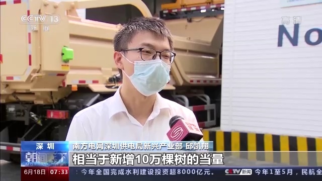 南方电网深圳供电局新兴产业部 邱凯翔:(这个)换电站的投运,能够减少1000多吨的二氧化碳的排放,相当于新增10万棵树的当量。