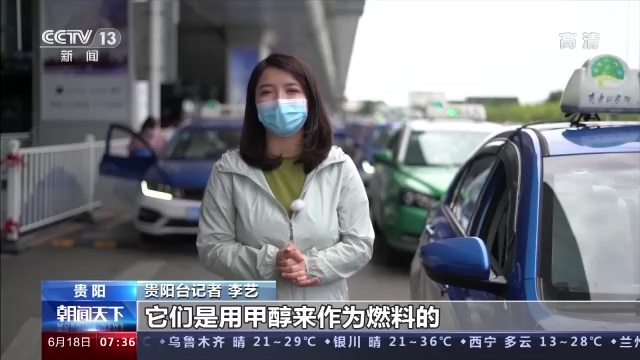 贵州台记者 李艺:我们来看看贵阳的甲醇出租车。我身后的出租车和许多城市的出租车不同,它们是以甲醇为燃料的。目前这样的出租车在贵阳有17000多台。有人说,甲醇出租车是贵阳的一张绿色名片。