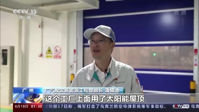 广汽埃安新能源工程部部长 潘镜池:这个工厂上面用了太阳能屋顶,布有5.5万块光伏板,超过8.9万平方米(的面积),一年下来的发电量超过1800万度,相当于整个工厂25%的用电量都可以满足。太阳好的情况下,整个工厂超过一半的用电量都可以通过光伏(发电)满足。