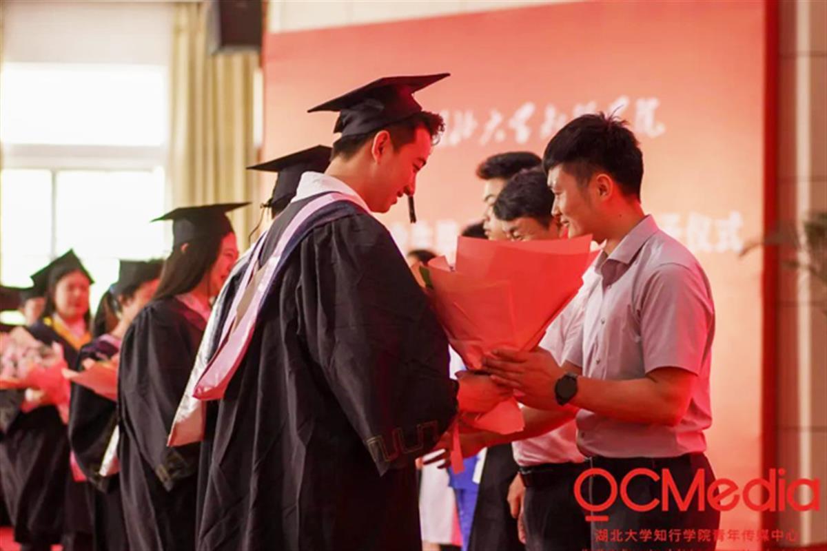 “站在台上时,学生穿着学位服给我们献花,成就感满满。”2022年6月16日,在辅导员岗位工作了六年的湖北大学知行学院廖宗涛老师第一次站在毕业典礼的台上,他作为辅导员代表从毕业生手中接过捧花。当天,一批学校最普通的教职工代表登上了毕业典礼的讲台,接受同学们的献花。