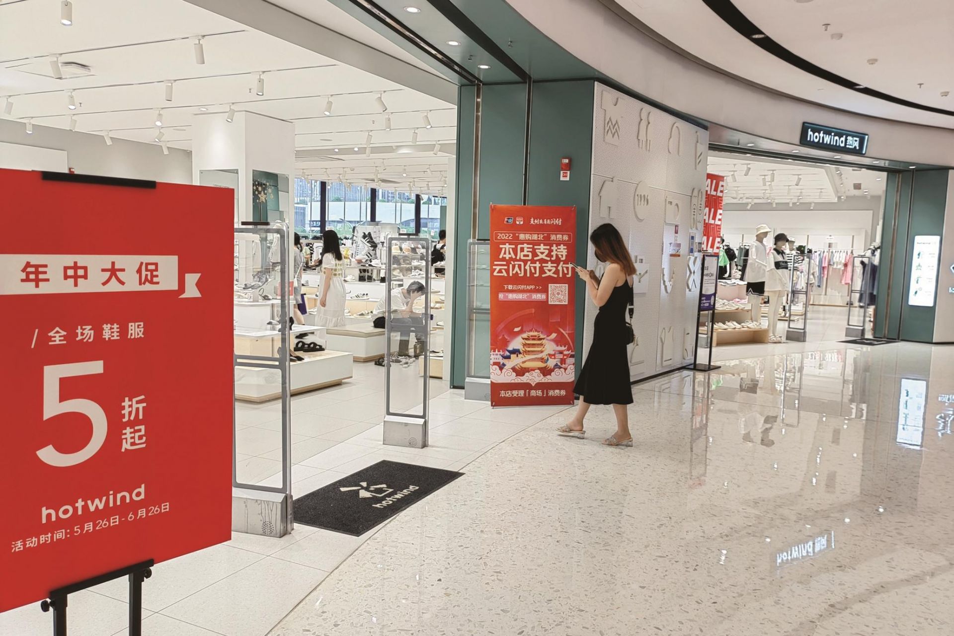 6月18日下午,在武汉江宸天街,极目新闻记者看到,多家店铺打出了“本店可使用‘惠购湖北’消费券”的海报,吸引消费者进店。