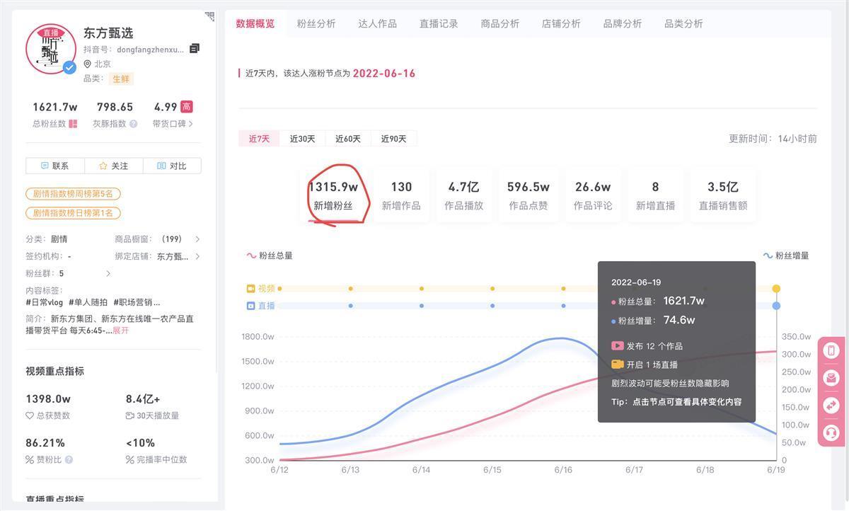 不过,即使7天内3次掉粉,刘畊宏直播间目前粉丝基数仍超7000万。新晋爆火的东方甄选抖音账号粉丝数刚超1600万。