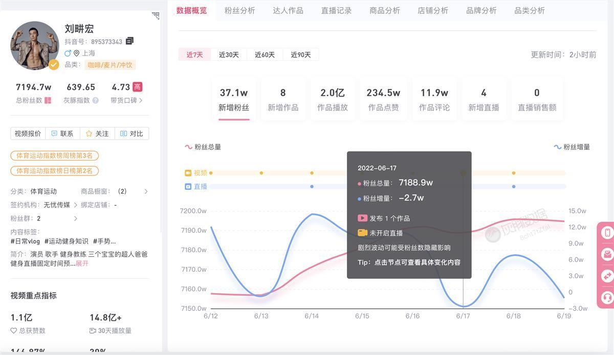 第三方平台数据显示刘畊宏直播间近日出现3次掉粉
