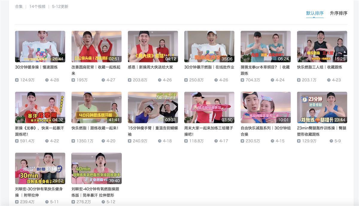 极目新闻记者注意到,在视频网站B站,刘畊宏官方账号的健身录播视频从4月28日开始上传,一直更新至5月12日。目前,14个健身视频的播放量均在百万以上,4月20日的跟练视频播放量达到1350万,最新上传的跟练视频播放量则已下降至276万。
