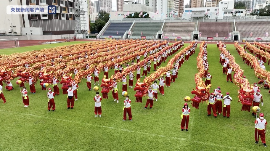 当日现场气氛热烈,来自香港不同社团的约2500位青年在草坪上舞动25条大金龙,欢声雷动、鼓乐齐鸣庆祝香港回归祖国25周年,并带出香港由治及兴再出发、同为香港开新篇的祝福。