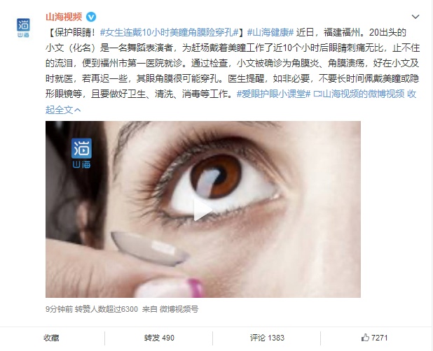 近日,福建福州。20岁出头的小文(化名)是一名舞蹈表演者,为赶场戴着美瞳工作了近10个小时后眼睛刺痛无比,止不住的流泪,便到福州市第一医院就诊。通过检查,小文被确诊为角膜炎、角膜溃疡,好在小文及时就医,若再迟一些,其眼角膜很可能穿孔。医生提醒,如非必要,不要长时间佩戴美瞳或隐形眼镜等,且要做好卫生、清洗、消毒等工作。