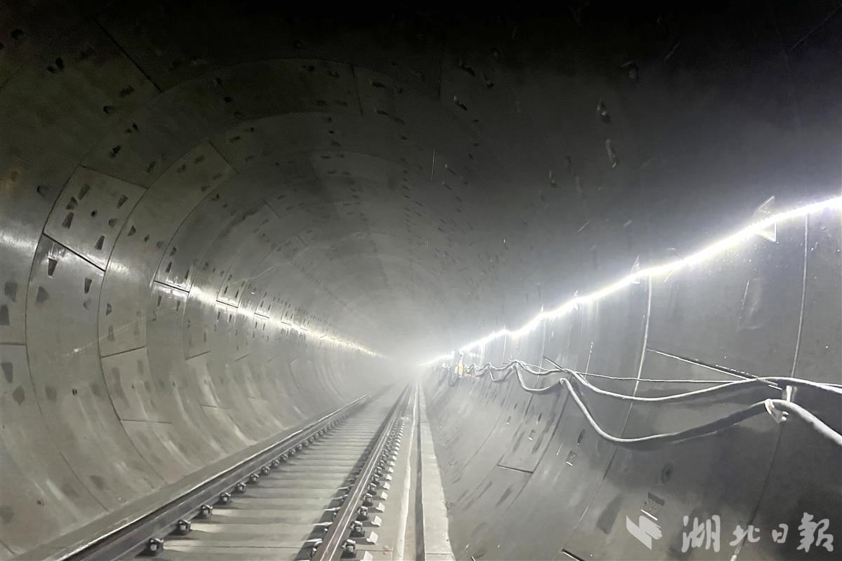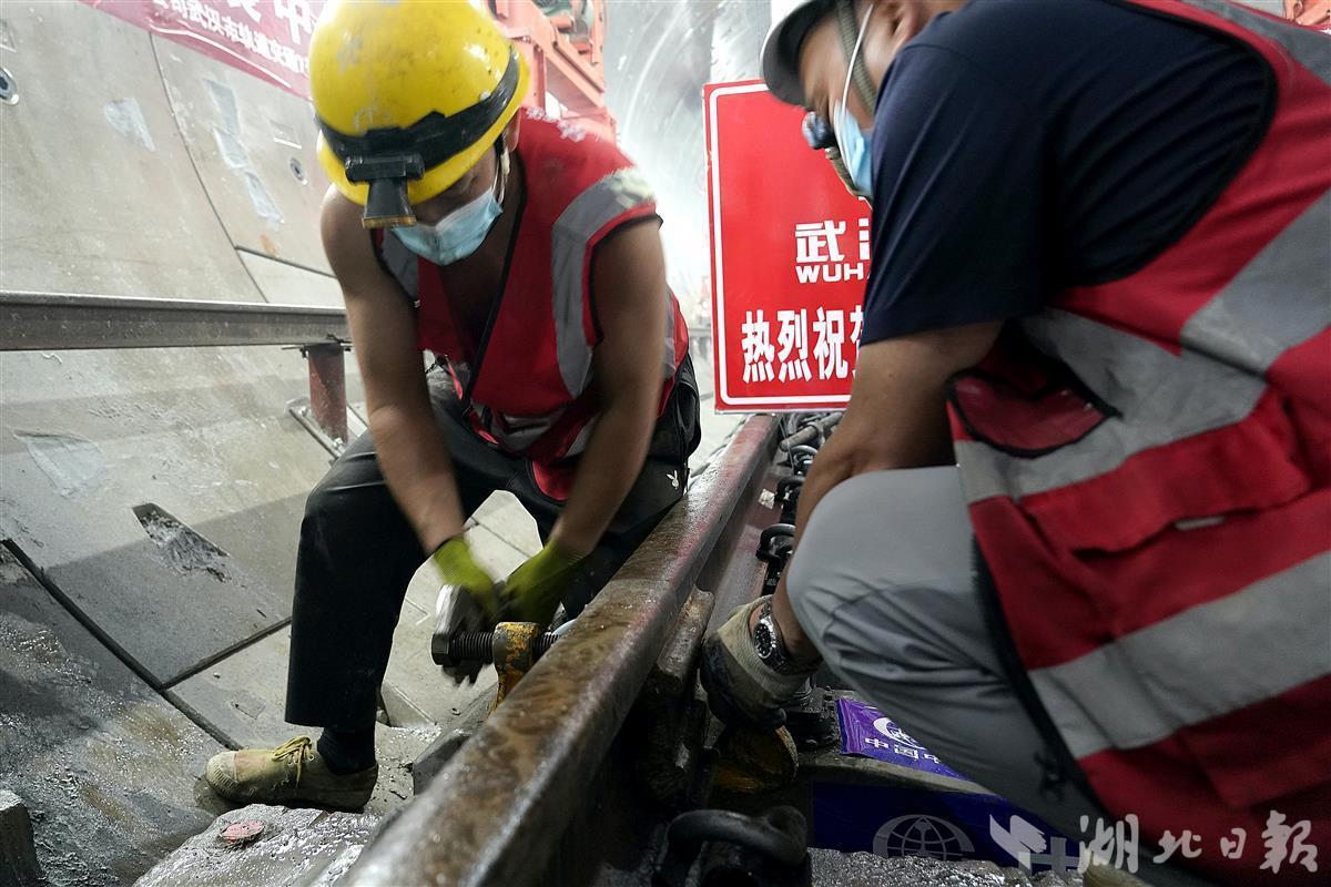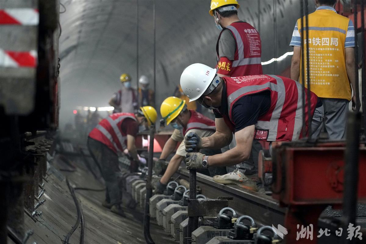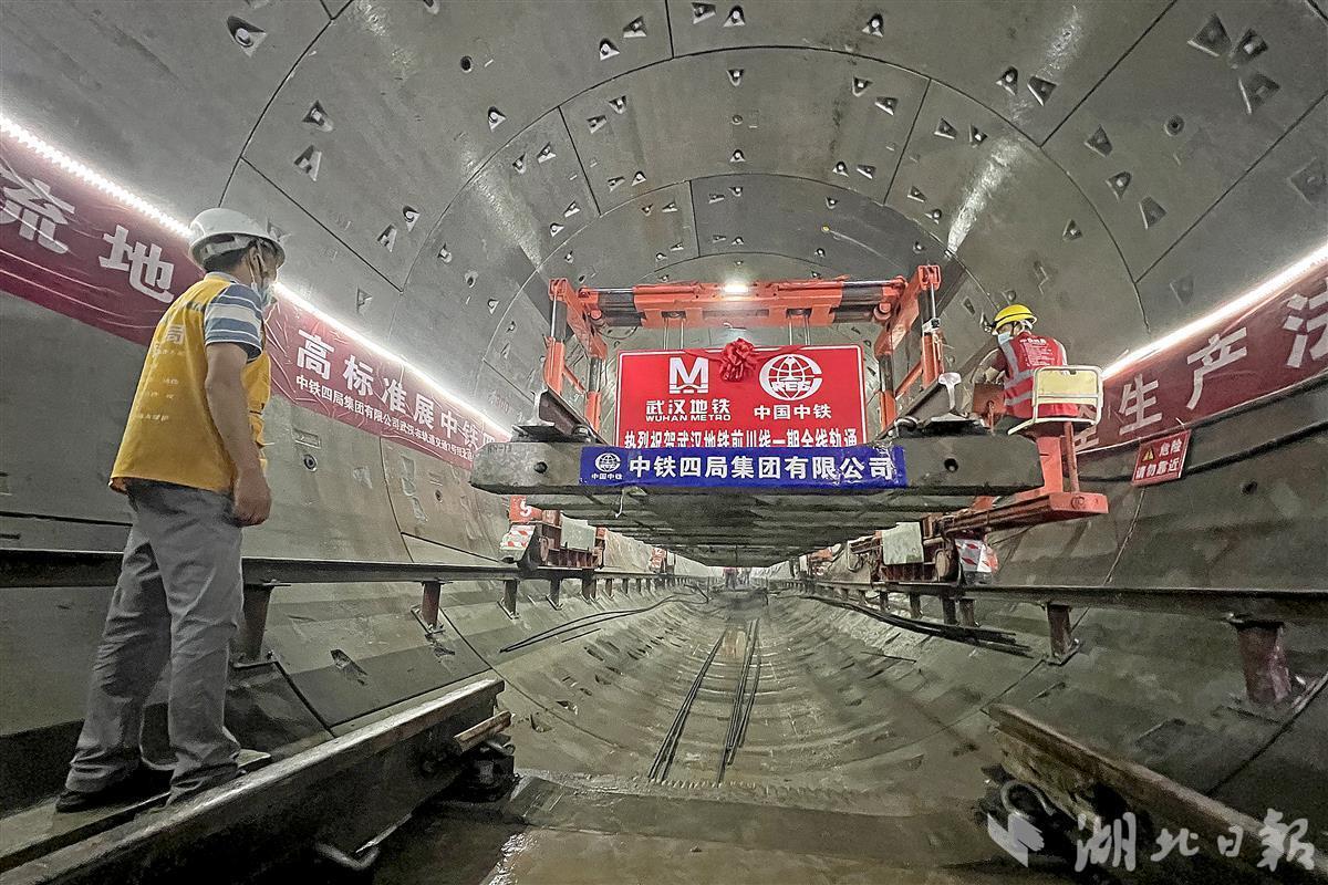 2022年6月20日,在武汉地铁前川线滕龙大道-巨龙大道区间,施工人员正在铺设最后一组轨排。当日,前川线一期实现全线“轨通”。