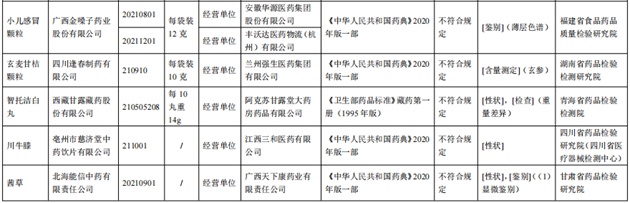 经福建省食品药品质量检验研究院检验,标示为广西金嗓子药业股份有限公司生产的2批次小儿感冒颗粒不符合规定,不符合规定项目为鉴别。