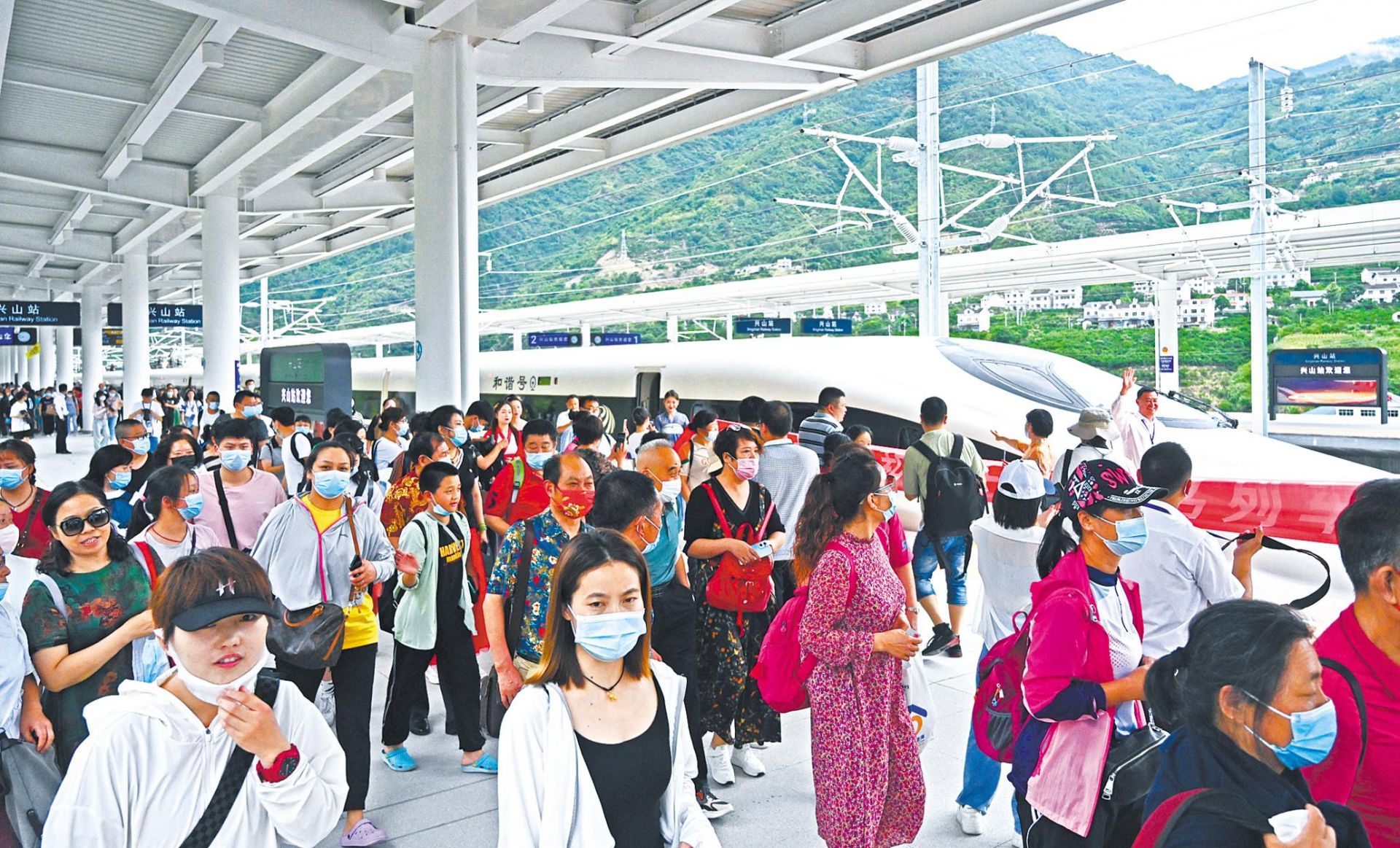 郑渝高铁襄万段首趟列车G6791次“昭君故里 和美兴山”号进站,500多名旅客走出列车,到达兴山。 (湖北日报全媒记者 刘曙松 通讯员 远景 长娇 摄)