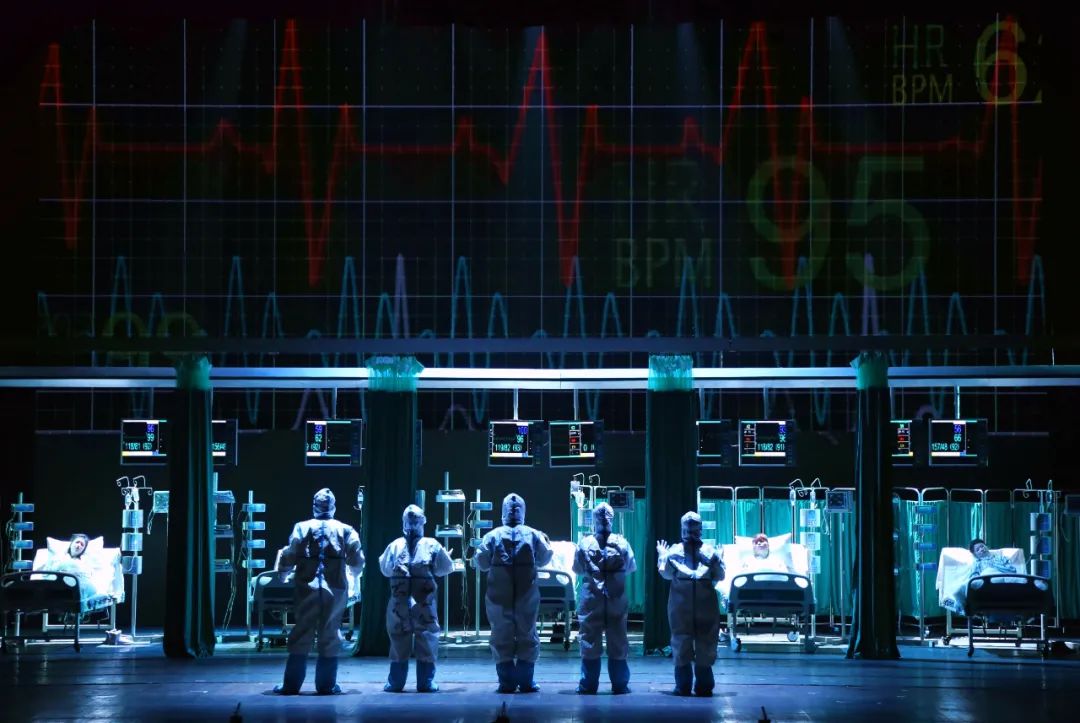 空无一人的长江大桥、此起彼伏的救护车笛声、脚步匆忙的白衣战士……舞台上大幕开启,瞬间就将现场观众拉回到新冠肺炎疫情暴发初期。