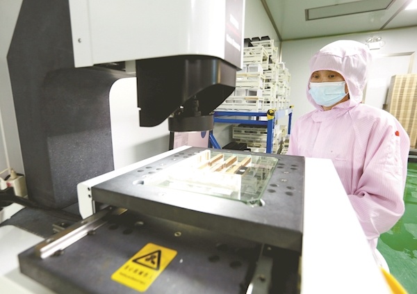 湖北仁誉科技有限公司员工在无尘净化车间生产线生产检测超薄触控屏面板。