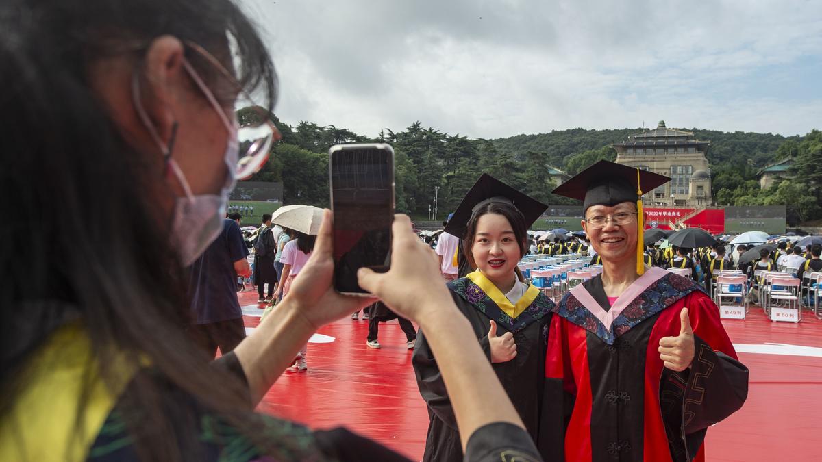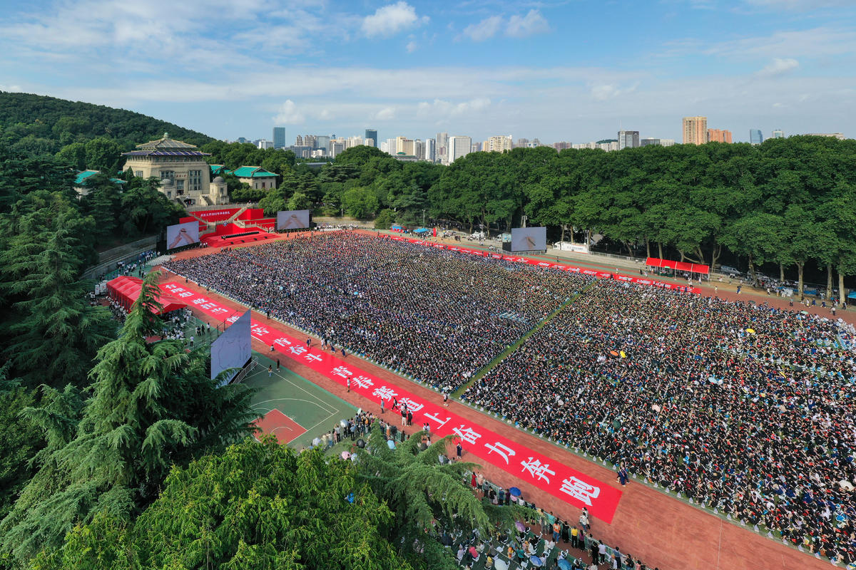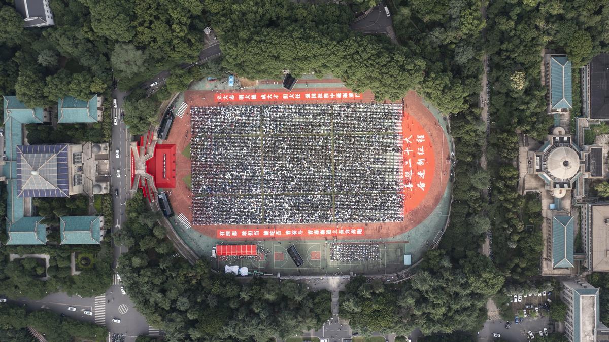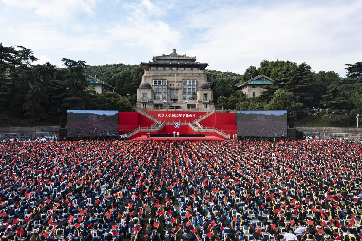 武汉大学2022年毕业典礼在九一二操场举行,全校超万名师生共同参与。