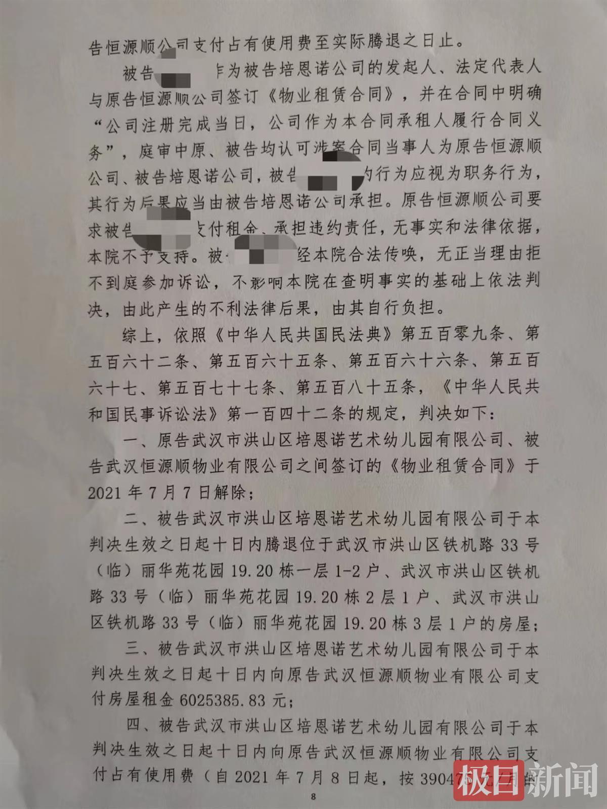 近日,武汉恒源顺物业有限公司相关负责人刘先生向极目新闻反映,几年前,公司把一处房屋租给洪山区培恩诺艺术幼儿园,幼儿园此后出现了拖欠租金的违约行为。今年3月,法院终审维持原判:双方解除《物业租赁合同》,幼儿园腾退房屋,并支付拖欠房租602万余元,以及占有使用费、违约金117万元等。至今已过3个月,幼儿园仍未执行该判决。