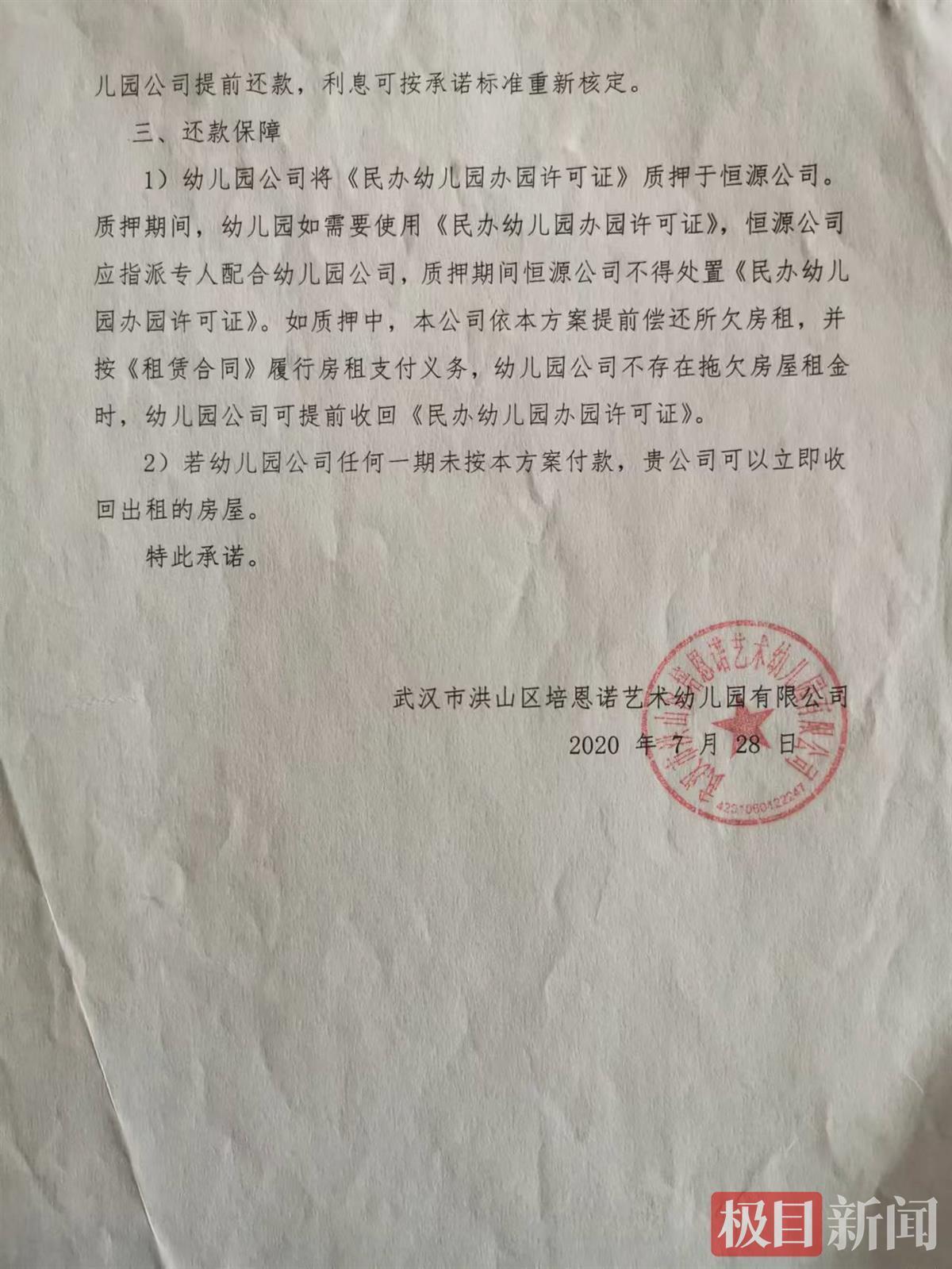 当日下午,培恩诺艺术幼儿园一位负责人致电记者介绍,该幼儿园是洪山区一站式教育综合体,2018年签合同开始装修,投资巨大,2019年开业,后来遇到疫情关了8个月,之后门口修地铁又陆续停了6个月,作为一家民营企业,在这种困境的情况下,还是向恒源顺公司支付了几百万租金。至于拖欠的租金,不是不给,而是希望房东能够考虑租户的难处,给幼儿园一定的扶持,降低租金继续出租,但恒源顺公司不愿意商谈。而且,恒源顺公司也未提供发票。