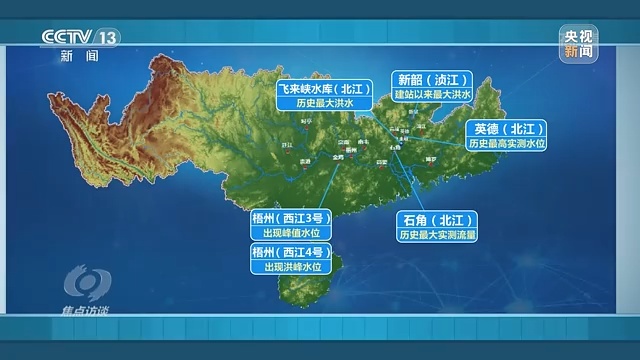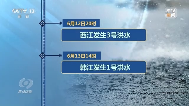 6月12日20时,西江发生3号洪水;6月13日14时,韩江发生1号洪水;