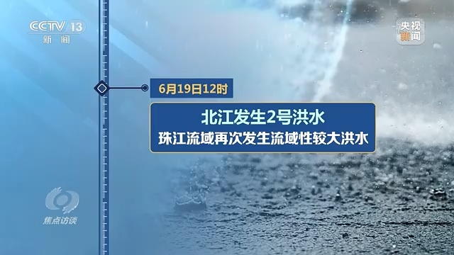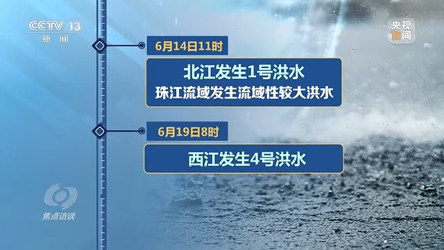 6月14日11时,北江发生1号洪水,珠江流域发生流域性较大洪水;6月19日8时,西江发生4号洪水;
