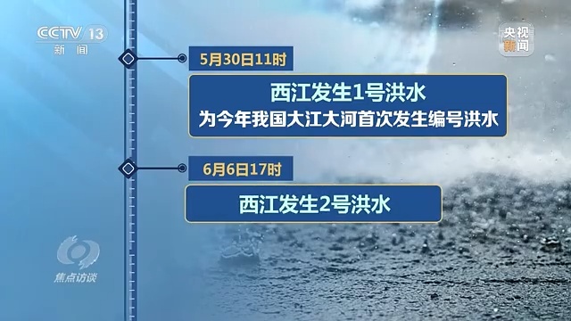 5月30日11时,西江发生1号洪水,为今年我国大江大河首次发生编号洪水;6月6日17时,西江发生2号洪水;